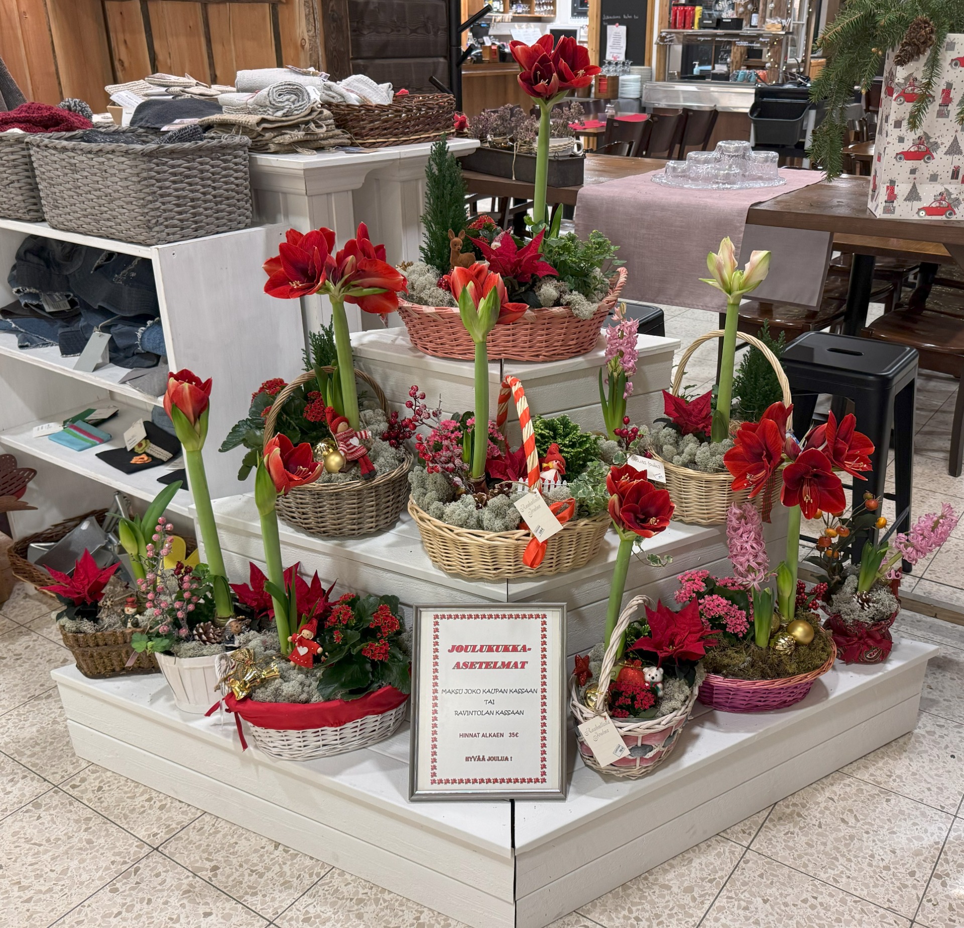 Tarjoamme ammattitaitoista ja luovaa uniikkien joulukukka-asetelmien valmistusta Heinolan alueella. Asetelmat tehdään tarvittaessa asiakkaan toiveiden ja tarpeiden mukaan, ja toimitamme ne suoraan asiakkaalle.( 10 km säteellä Heinolan keskustasta sis. hintaan).